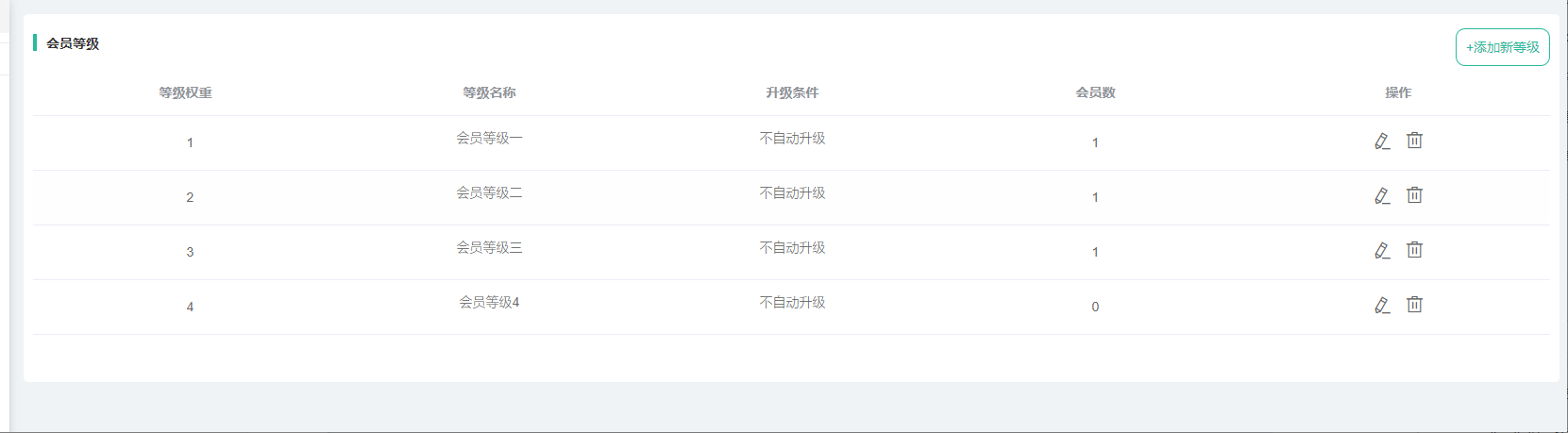 所有成为商城的会员等级为默认等级,可以通过后台-会员管理手动调整会员等级,也可以设置会员自动升级。