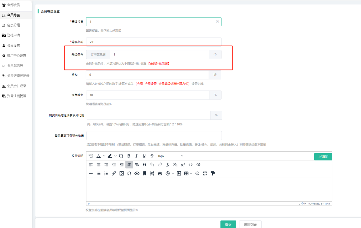 在“会员管理——会员等级”添加等级时,假设升级条件是完成订单数量,设置好后会员达到了设置的升级条件完成X笔订单数量后即可自动升级。